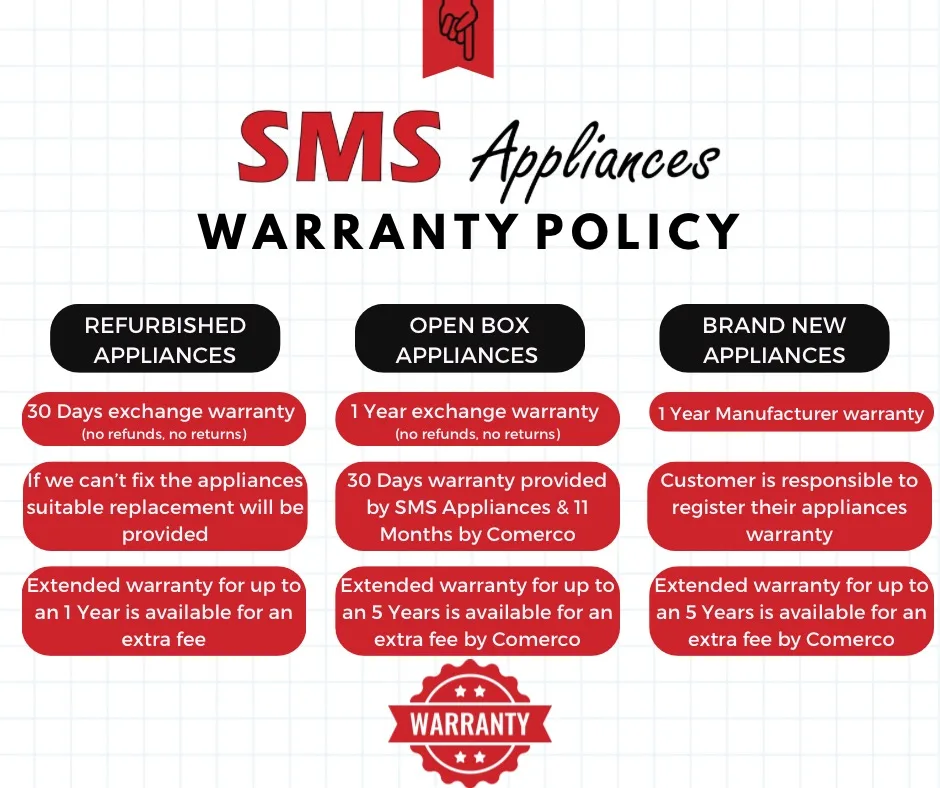 1. 1 Year exchange warranty (no refunds, no returns) 2. 30 Days warranty provided by SMS Appliances & 11 Months by Comerco 3. Extended warranty for up to an 5 years is available for an extra free by Comerco