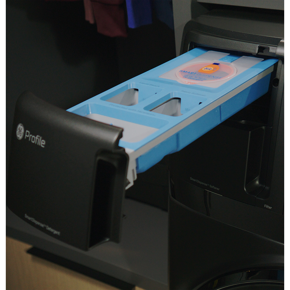 Holds enough detergent and softener for up to 32 loads. Plus, scan the barcode on the detergent or softener bottle with the SmartHQ™ app and the washer will dispense the right amount